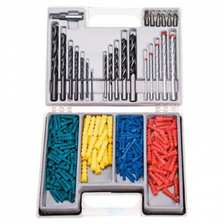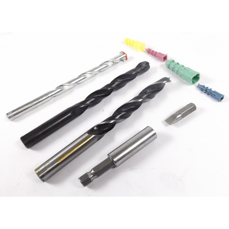 Wiertła różne (metal/beton/drewno), zestaw 27 szt. + kołki rozporowe, metal: 2.0, 3.0, 4.0, 5.0, 6.0, 8.0, 10.0 mm, beton: 4, 5, 6, 8, 10 mm, drewno: 4, 5, 6, 8, 10 mm