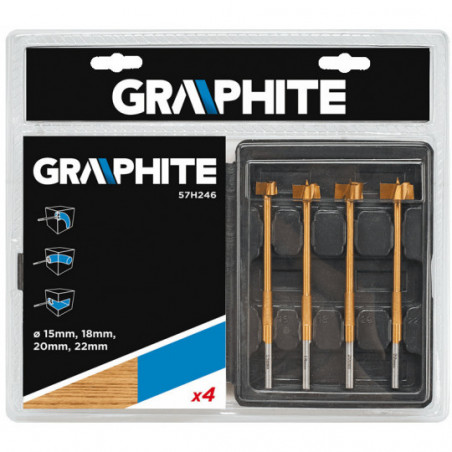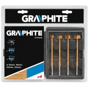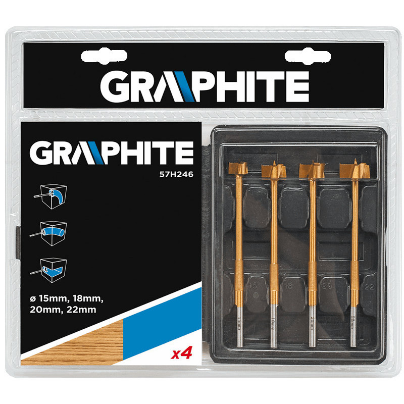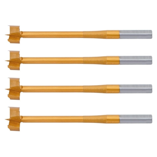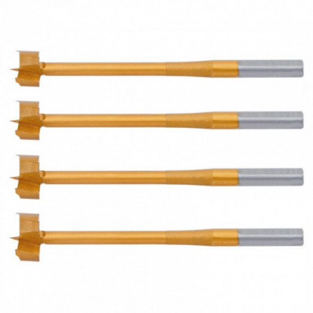 Frezy do drewna uniwersalne, zestaw 4 szt., O 15, 18, 20, 22 mm, długość 130 mm, ostrza pokryte azotkiem tytanu, plastikowa kasetka do przechowywania