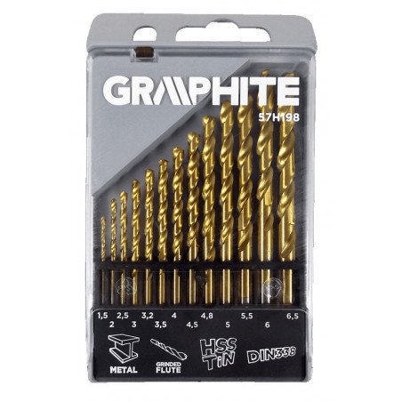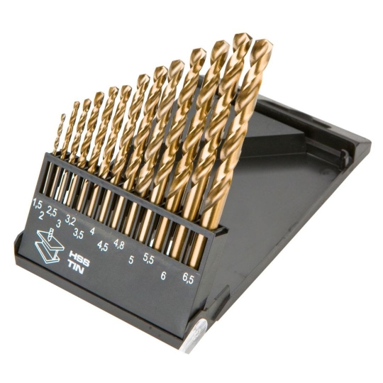 Wiertła do metalu HSS-TiN, 1.5-6.5 mm, zestaw 13 szt., 1.5, 2, 2.5, 3, 3.2, 3.5, 4, 4.2, 4.8, 5, 5.5, 6, 6.5 mm, głęboko szlifowane, stal 9341, kąt wierzchołkowy 135°, korekta ścinu, DIN338