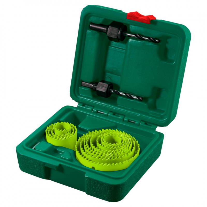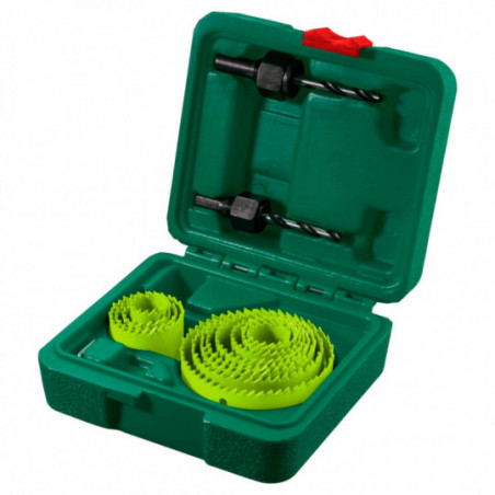 Zestaw otwornic, adapter 2 szt., otwornice 12 szt .: 19, 22, 25, 29, 32, 35, 38, 44, 51, 57, 64, 76 mm, plastikowa kaseta do przechowywania.