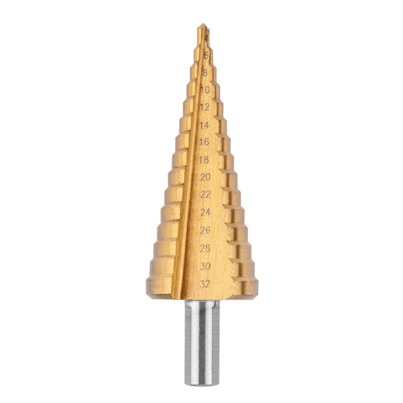 Zestaw wierteł stopniowych HSS, 3 szt, powłoka TiN, 4-12 mm, 4-20 mm, 4-32 mm, stopniowanie co 2 mm