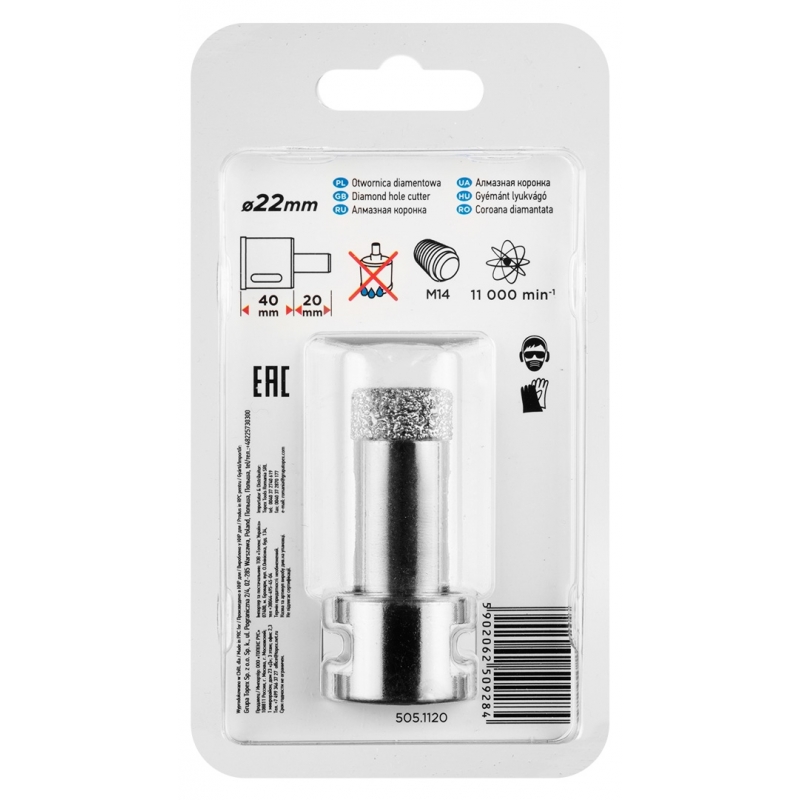 Otwornica diamentowa, średnica 22 mm, długość robocza 40 mm, długość całkowita 60 mm, gwint M14, lutowana próżniowo (vacuum brazed), do pracy na sucho, 11000 obr/min.