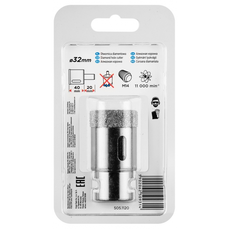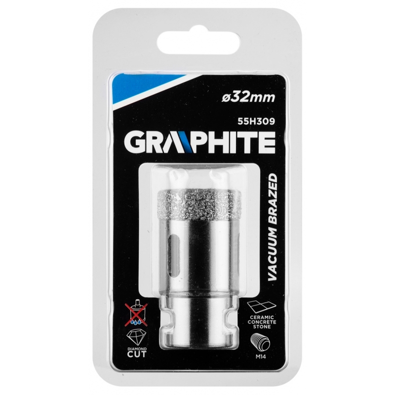 Otwornica diamentowa, średnica 32 mm, długość robocza 40 mm, długość całkowita 60 mm, gwint M14, lutowana próżniowo (vacuum brazed), do pracy na sucho, 11000 obr/min.