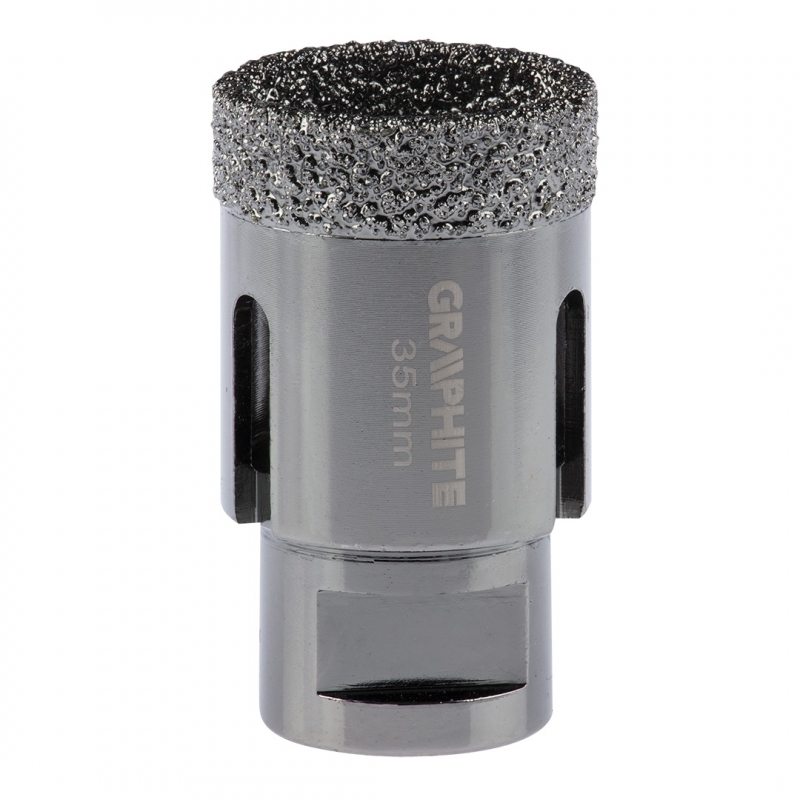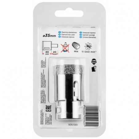 Otwornica diamentowa, średnica 35 mm, długość robocza 40 mm, długość całkowita 60 mm, gwint M14, lutowana próżniowo (vacuum brazed), do pracy na sucho, 11000 obr/min.