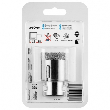 Otwornica diamentowa, średnica 40 mm, długość robocza 40 mm, długość całkowita 60 mm, gwint M14, lutowana próżniowo (vacuum brazed), do pracy na sucho, 11000 obr/min.