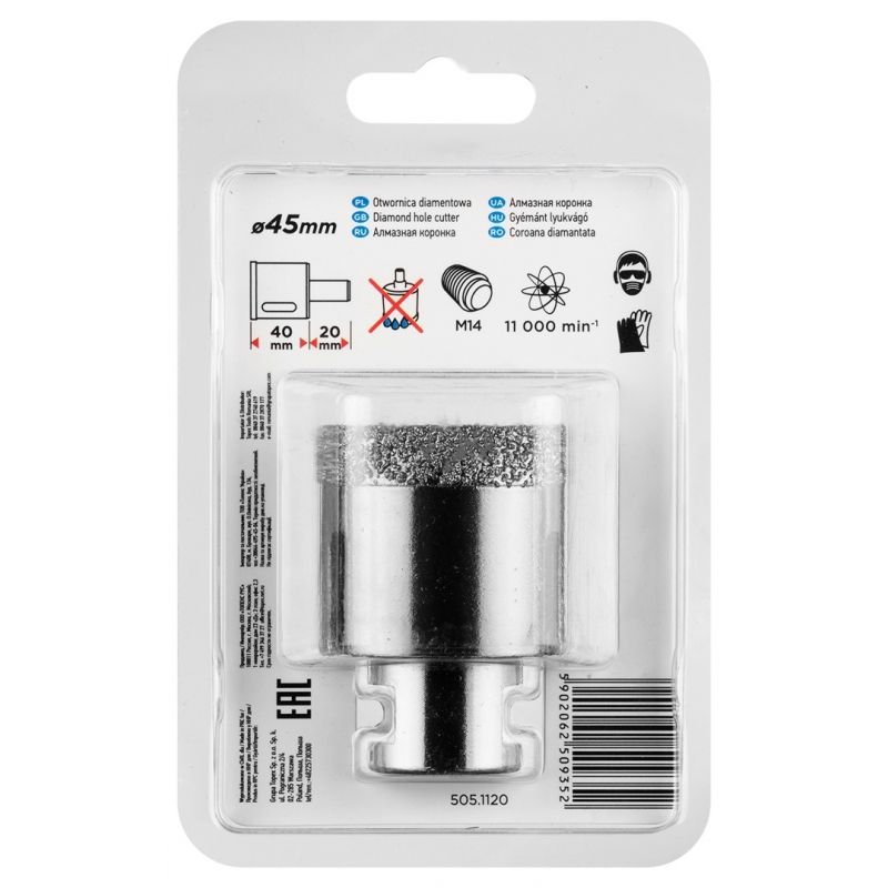 Otwornica diamentowa, średnica 45 mm, długość robocza 40 mm, długość całkowita 60 mm, gwint M14, lutowana próżniowo (vacuum brazed), do pracy na sucho, 11000 obr/min.