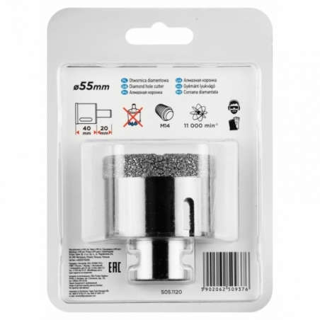 Otwornica diamentowa, średnica 55 mm, długość robocza 40 mm, długość całkowita 60 mm, gwint M14, lutowana próżniowo (vacuum brazed), do pracy na sucho, 11000 obr/min.