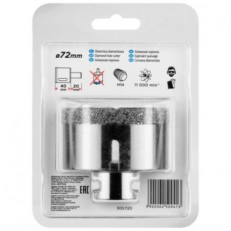Otwornica diamentowa, średnica 72 mm, długość robocza 40 mm, długość całkowita 60 mm, gwint M14, lutowana próżniowo (vacuum brazed), do pracy na sucho, 11000 obr/min.