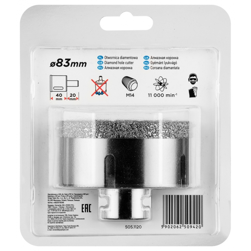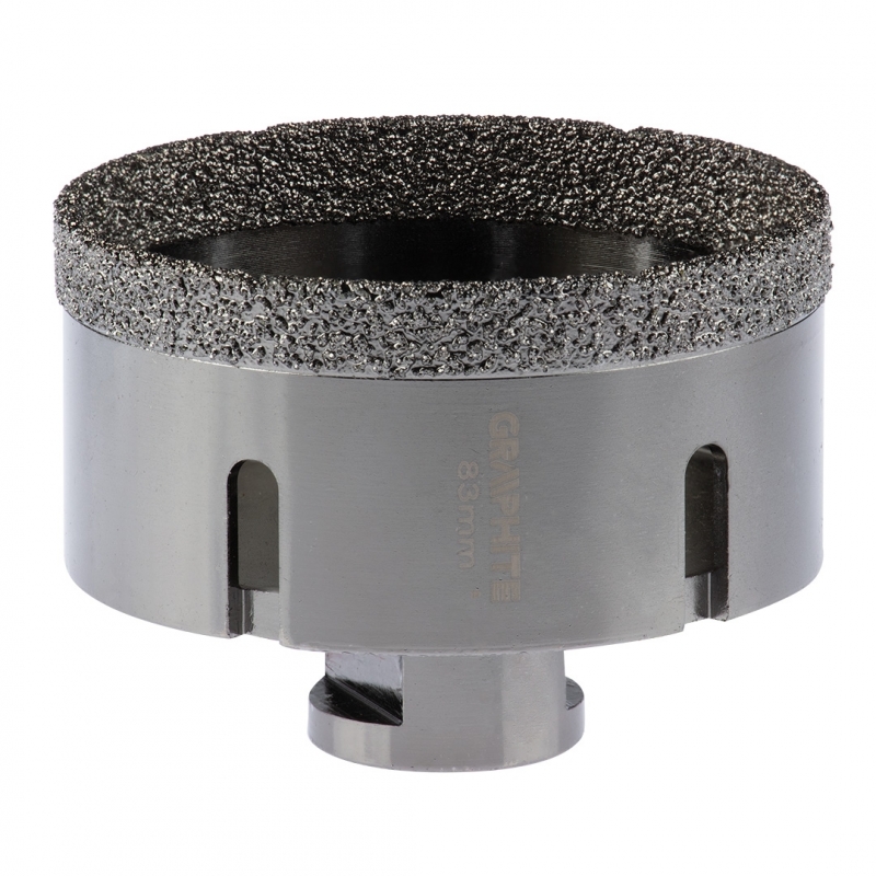 Otwornica diamentowa, średnica 83 mm, długość robocza 40 mm, długość całkowita 60 mm, gwint M14, lutowana próżniowo (vacuum brazed), do pracy na sucho, 11000 obr/min.