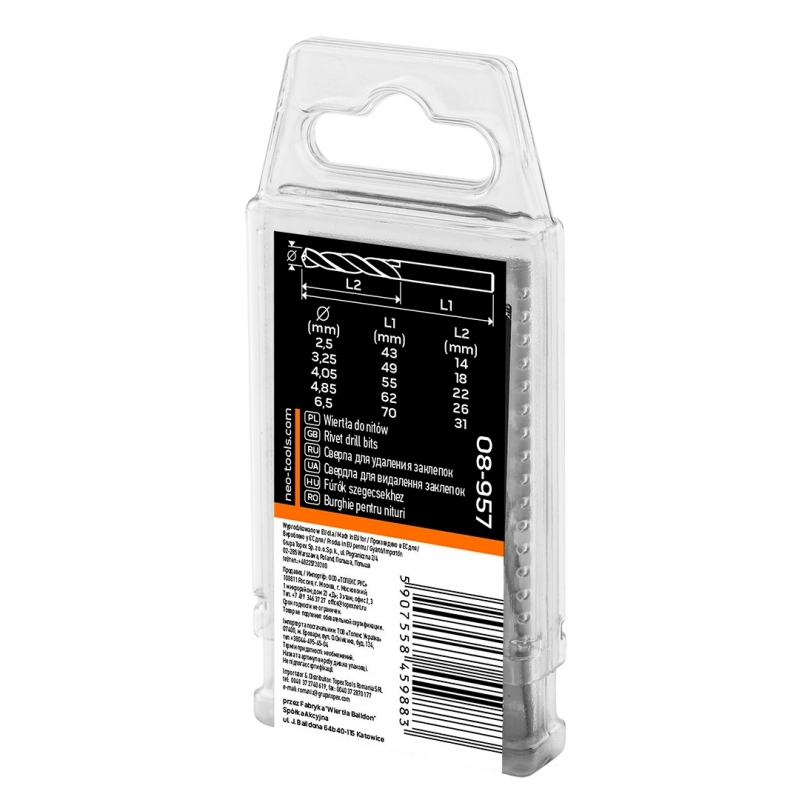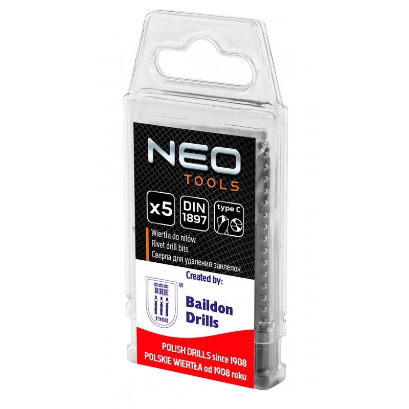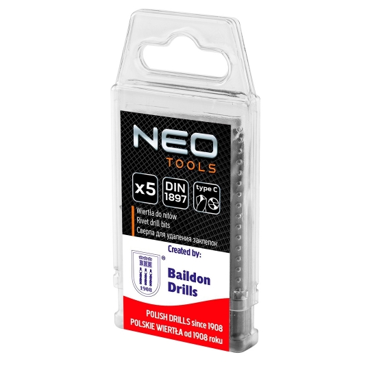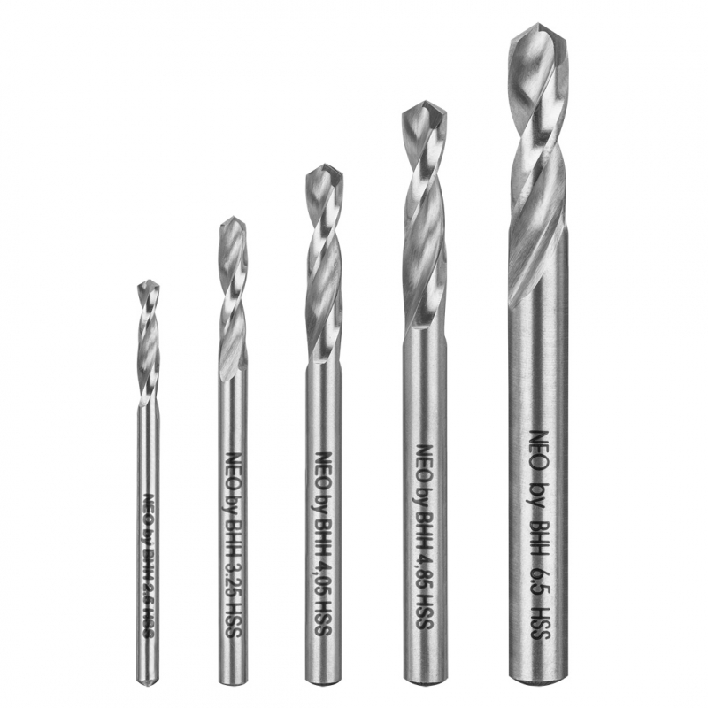 Wiertła do rozwiercania nitów samozrywalnych, krótkie, HSS, średnice: 2.5, 3.25, 4.05, 4.85, 6.5mm, DIN 1897 RN, korekcja ostrza typu „C”, zaostrzenie wiertła wykonane pod kątem 118 stopni, zestaw 5 szt.