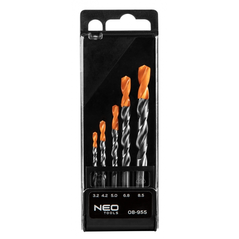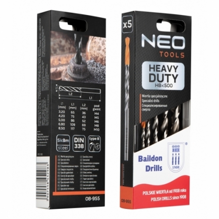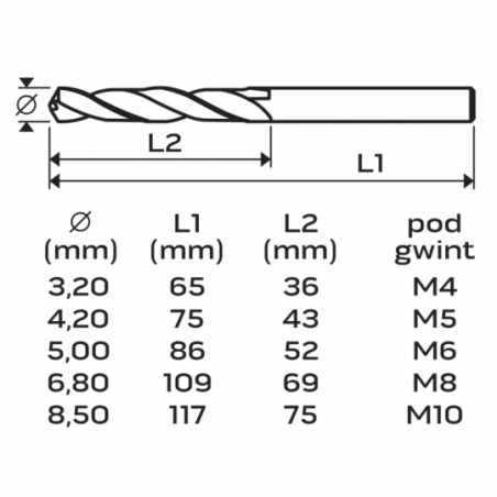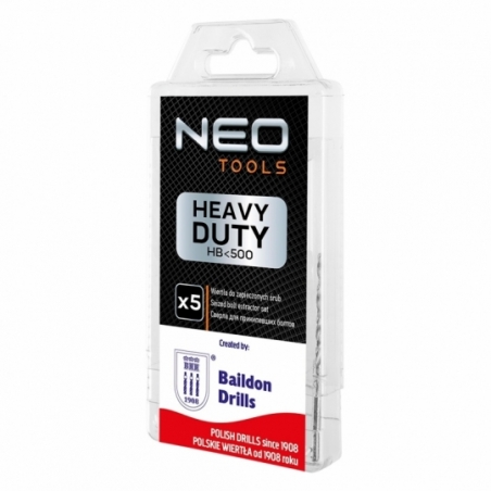 Wiertła do rozwiercania zapieczonych śrub, długie, SK8m - HSS-E Co8, rozmiary [średnica x dł. całkowita x dł. robocza]: 3.2 x 65 x 36 mm - pod gwint M4, 4.2 x 75 x 43 mm - pod gwint M5, 5.0 x 86 x 52 mm - pod gwint M6, 6.8 x 109 x 69 mm - pod gwint M8, 8.5 x 117 x 75 mm - pod gwint M10, DIN 338 RN, korekcja ostrza typu „B”, zestaw 5 szt.