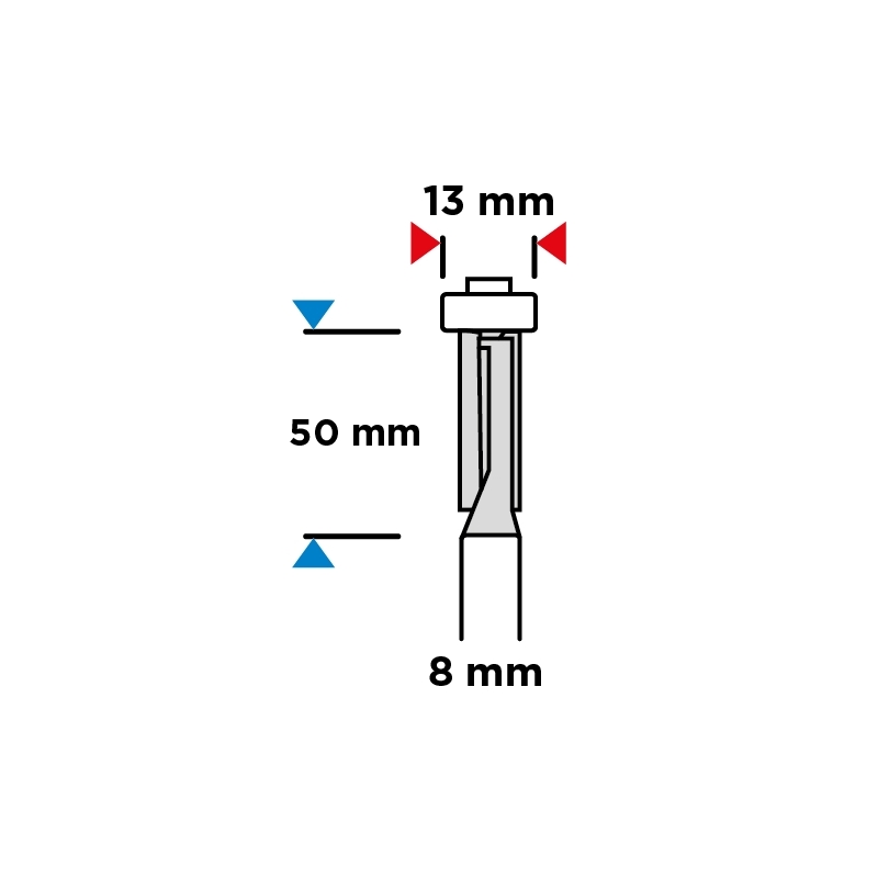 Frez prosty z dolnym łożyskiem długi, płytka z węglika spiekanego (HM), średnica robocza freza 13 mm, długość robocza 50 mm, średnica trzpienia 8 mm, frez łożyskowany, do drewna