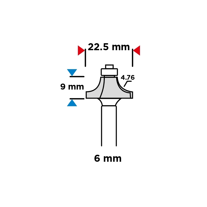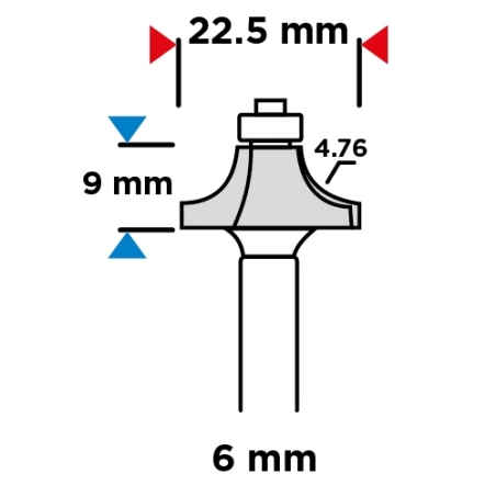 Frez kształtowy z łożyskiem zaokrąglający, płytka z węglika spiekanego (HM), średnica robocza freza 22.5 mm, długość robocza freza 9 mm, średnica trzpienia 6 mm, do drewna