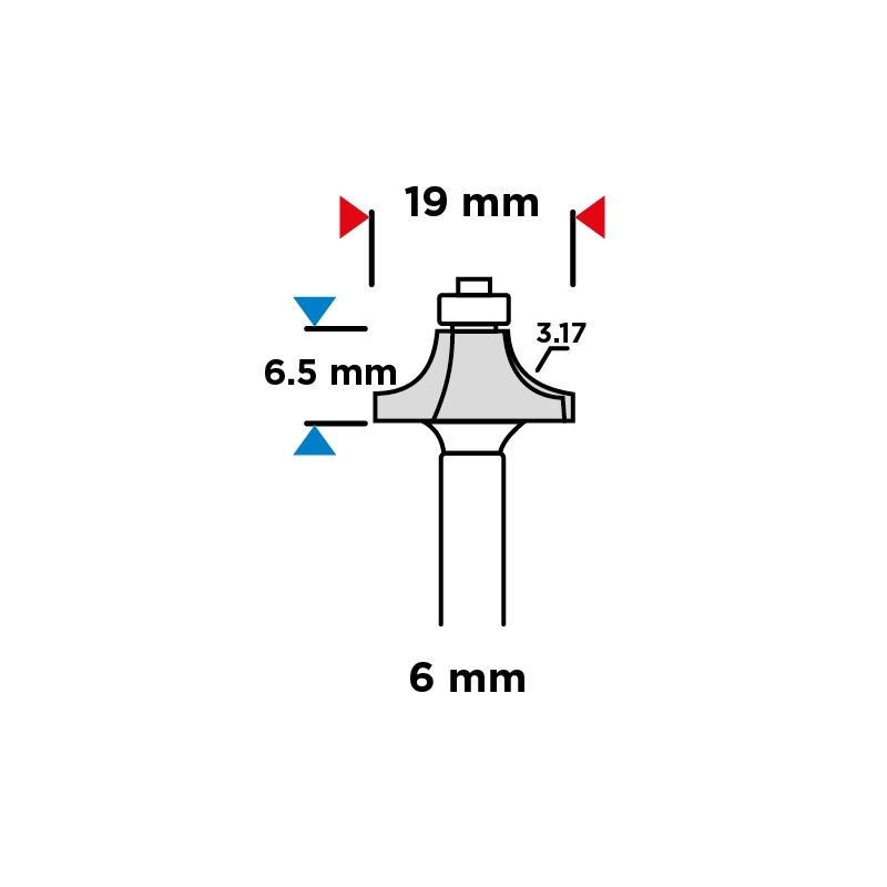 Frez kształtowy z łożyskiem zaokrąglający, płytka z węglika spiekanego (HM), średnica robocza freza 19 mm, długość robocza freza 6.5 mm, średnica trzpienia 6 mm, do drewna