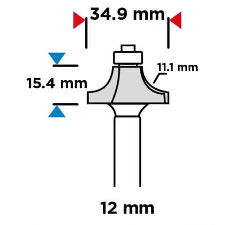 Frez kształtowy z łożyskiem zaokrąglający, płytka z węglika spiekanego (HM), średnica robocza freza 34.9 mm, długość robocza freza 15.4 mm, średnica trzpienia 12 mm, do drewna