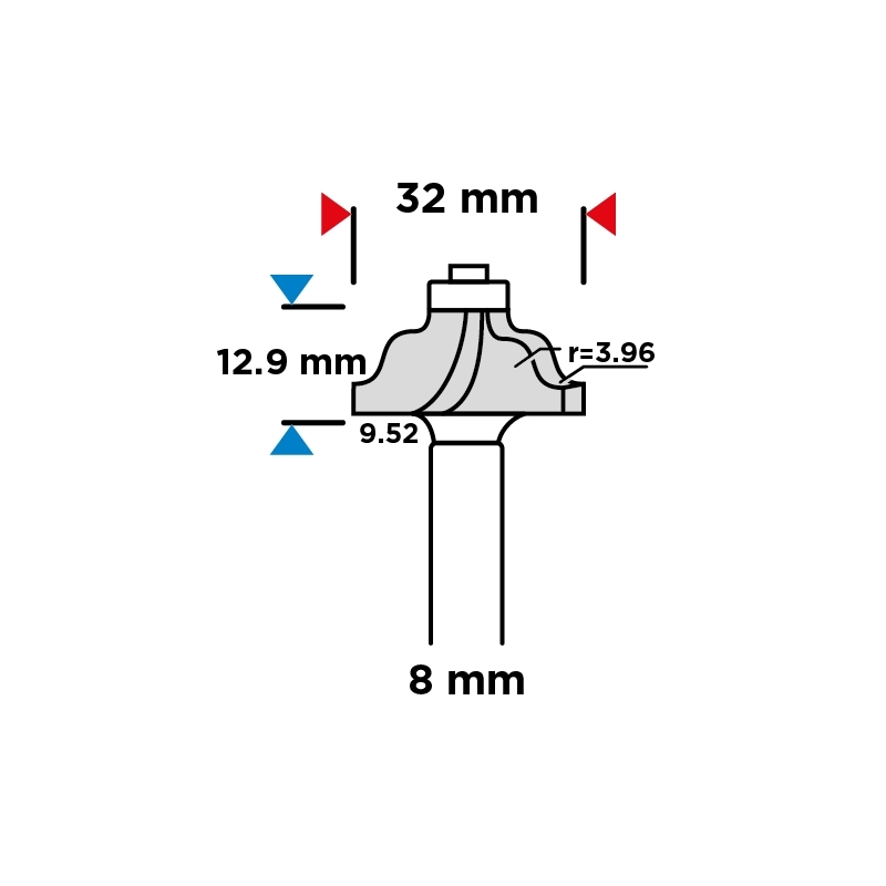 Frez kształtowy z łożyskiem zaokrąglający, płytka z węglika spiekanego (HM), średnica robocza freza 32 mm, długość robocza freza 12.9 mm, średnica trzpienia 8 mm, do drewna