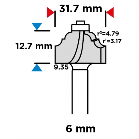 Frez kształtowy z łożyskiem ozdobny, płytka z węglika spiekanego (HM), średnica robocza freza 31.7 mm, długość robocza freza 12.7 mm, średnica trzpienia 6 mm, do drewna