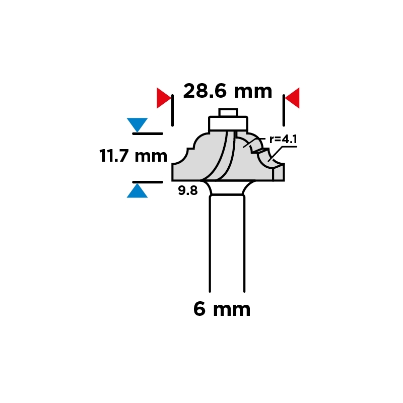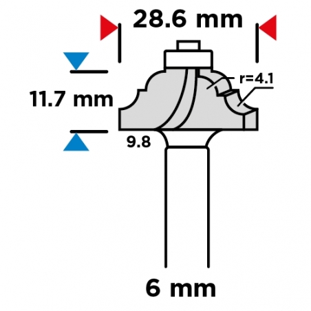 Frez kształtowy z łożyskiem ozdobny, płytka z węglika spiekanego (HM), średnica robocza freza 28.6 mm, długość robocza freza 11.7 mm, średnica trzpienia 6 mm, do drewna