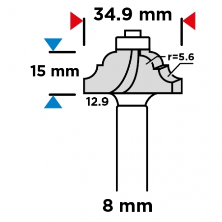 Frez kształtowy z łożyskiem ozdobny, płytka z węglika spiekanego (HM), średnica robocza freza 34.9 mm, długość robocza freza 15 mm, średnica trzpienia 8 mm, do drewna