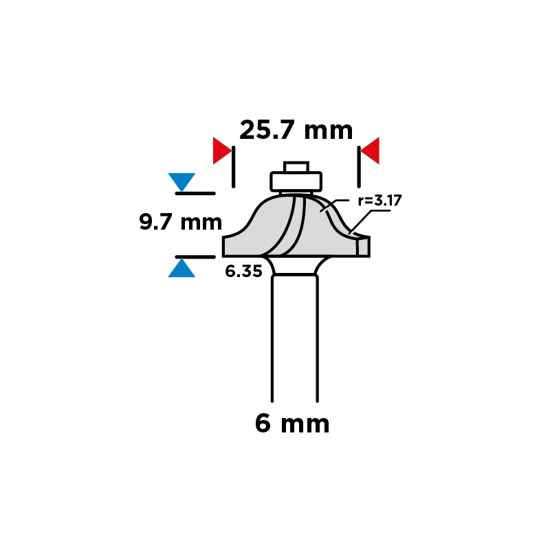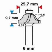 Frez kształtowy z łożyskiem ozdobny, płytka z węglika spiekanego (HM), średnica robocza freza 25.7 mm, długość robocza freza 9.7 mm, średnica trzpienia 6 mm, do drewna