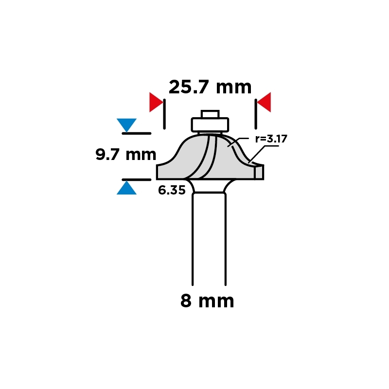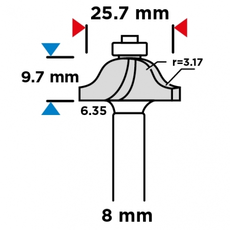 Frez kształtowy z łożyskiem ozdobny, płytka z węglika spiekanego (HM), średnica robocza freza 25.7 mm, długość robocza freza 9.7 mm, średnica trzpienia 8 mm, do drewna