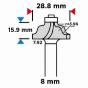 Frez kształtowy z łożyskiem ozdobny, płytka z węglika spiekanego (HM), średnica robocza freza 28.8 mm, długość robocza freza 15.9 mm, średnica trzpienia 8 mm, do drewna