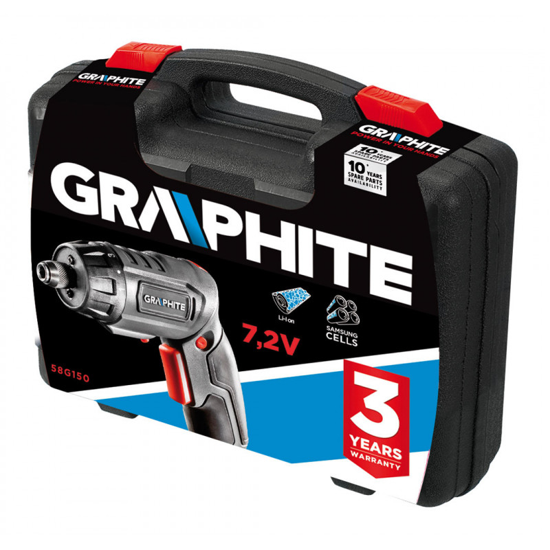 Wkrętak akumulatorowy 7.2V, Li-Ion/1.5Ah, obroty 230 min⁻¹, maks. moment obrotowy 5 Nm, uchwyt narzędziowy ¼’’ (6,35 mm), czas ładowania 3-5 godz., masa 0.52 kg, walizka, akcesoria: ładowarka - 1 szt, bity - 18 szt, adapter do końcówek