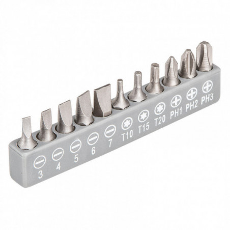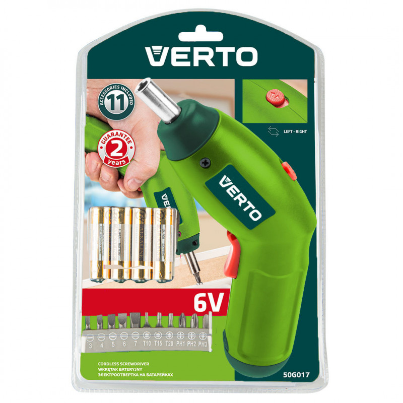 Wkrętak bateryjny 6V, obroty 180 min⁻¹, zasilanie 4 x baterie AA 1.5V; masa 0.21 kg; akcesoria w zestawie: końcówki wkrętakowe 11 szt, opakowanie blister