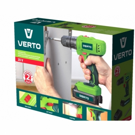 Wiertarko-wkrętarka akumulatorowa 20V, Li-Ion/1.5Ah, obroty I: 0-400 min⁻¹ II: 0-1500 min⁻¹, prawo/lewo, uchwyt samozaciskowy 0,8-10 mm, zakres momentu obrotowego 1-20 (oraz opcja wiercenia), ładowanie akumulatora 1 godz., hamulec wrzeciona, masa 0.9 kg, karton