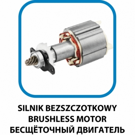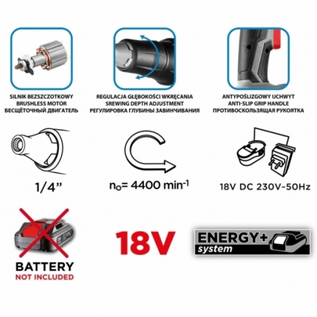 Wkrętarka bezszczotkowa akumulatorowa 18 V, 4400 obrotów na minutę, max moment obrotowy to 7 Nm,uchwyt ¼” HEX oraz regulacja głębokości wkręcania. włącznik pracy ciągłej. Akcesoria bity do wkręcania 10 sztuk. Waga 0,94 kg.