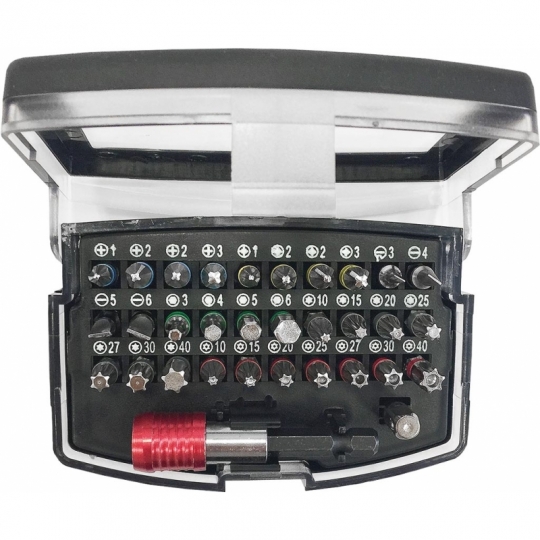 Zestaw zawiera 31 elementów: HEX3, HEX4, HEX5, HEX6, SL3, SL4, SL5, SL6, PH1, PH2, PH3, PZ1, PZ2, PZ2, PZ3, T10, T15, T20, T25, T27, T30, T40, T10, T15, T20, T25, T27, T30, T40, końcówkę do bitów.