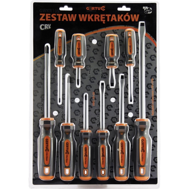 Zestaw wkrętaków. Zastosowano stal CR-V. HRC: 45-50. Rękojeść wykonana z PP+TPR. Certyfikat GS. Zestaw składa się z 10 elementów: PH3x150, PH2x100, PH1x75, PH0x75, PH2x40, SL5.0x100, SL6.0x100, SL8.0x200, SL6.0x40, SL3.0x75.