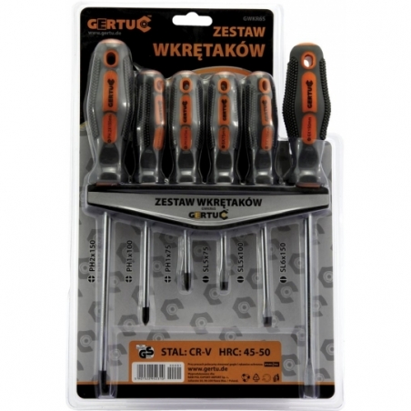 Zestaw wkrętaków. Zastosowano stal CR-V. HRC: 45-50. Rękojeść wykonana z PP+TPR. Certyfikat GS. Zestaw składa się z 6 elementów: PH2x150, PH1x100, PH1x75, SL5x75, SL5x100, SL6x150.
