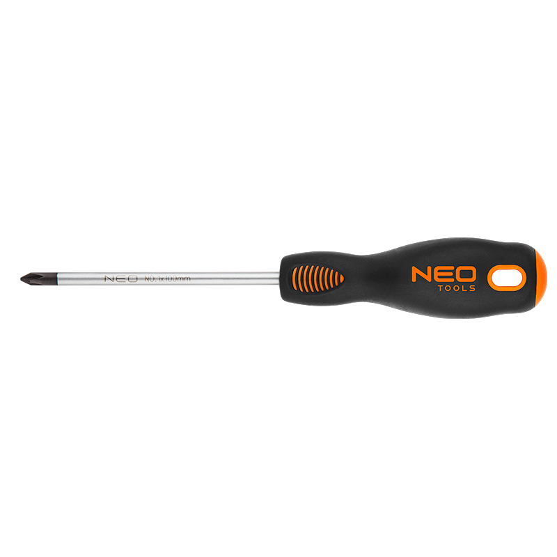 Wkrętak krzyżowy PH1 x 100 mm, S2, twardość końcówki roboczej 56 HRc, magnetyczna końcówka, trójgraniasty kształt uchwytu, wyprofilowane oparcie dla kciuka, uchwyt pokryty tworzywem TPR odpornym na działanie chemikaliów, olejów mineralnych, smarów, TÜV