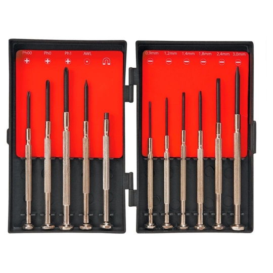 Wkrętaki precyzyjne, zestaw 11 szt., stal węglowa hartowana, rozmiary: płaskie 0.9 x 23 mm, 1.2 x 23 mm, 1.4 x 24 mm, 1.8 x 24 mm, 2.4 x 25 mm, 3.0 x 29 mm, PH00 x 23 mm, PH0 x 26 mm, PH1 x 27 mm, AWL x 27 mm, magnes x 6 mm