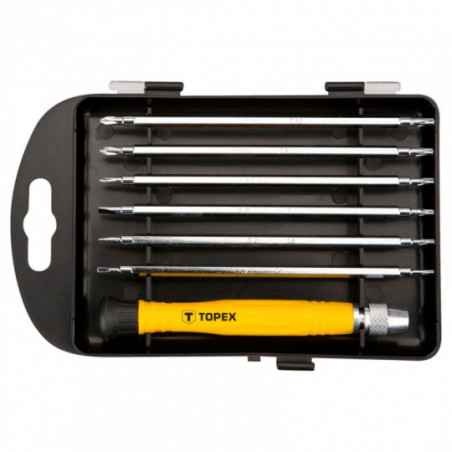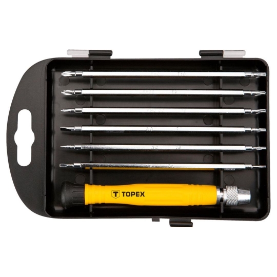 Wkrętaki precyzyjne, zestaw 7 szt., uchwyt wkrętakowy, 6 szt. grotów odwracalnych dwustronnych, rozmiary: 1.5 mm x T5, 2 mm x T6, 3 mm x T7, PH000 x T8, PH00 x T9, PH0 x T10, stal CrV