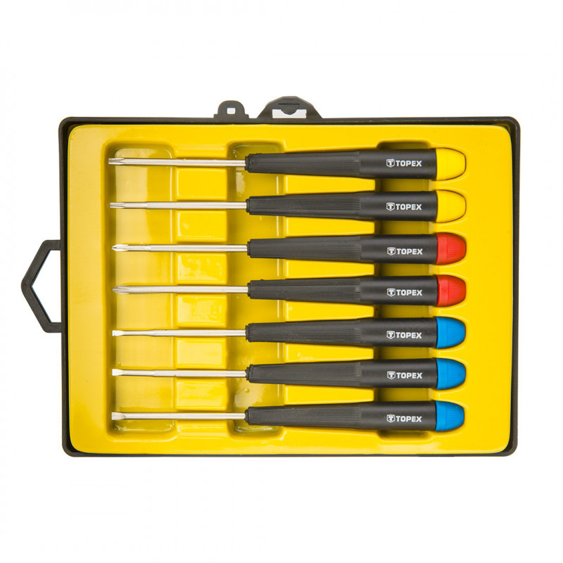 Wkrętaki precyzyjne, zestaw 7 szt., rozmiary: 2 x 50 mm, 2.5 x 50 mm, 2 x 50 mm, PH000 x 50 mm, PH0 x 50 mm, T8 x 50 mm, T10 x 50 mm, stal CrV