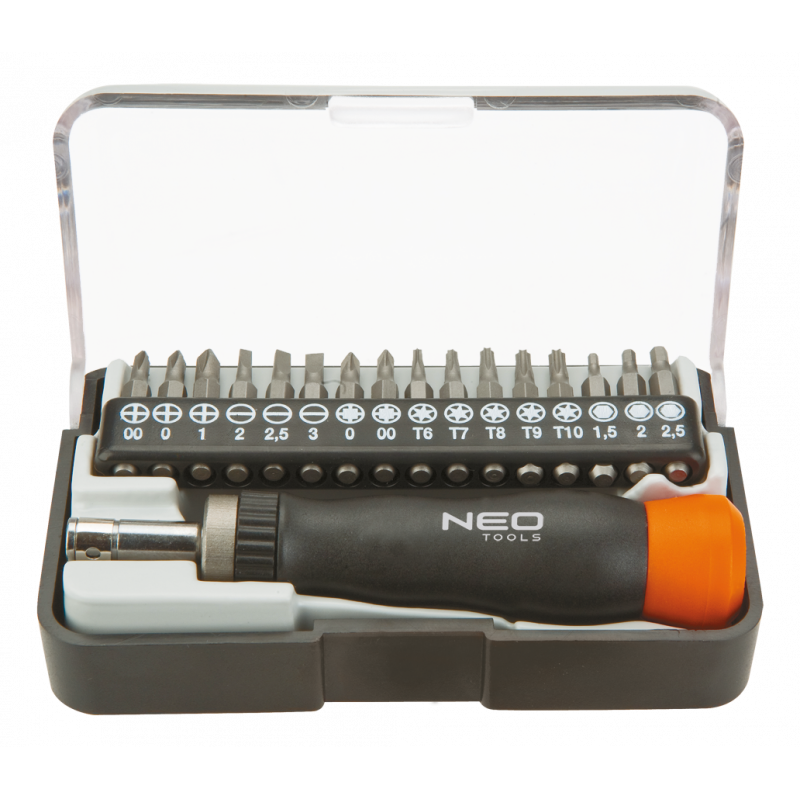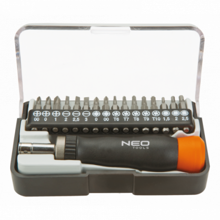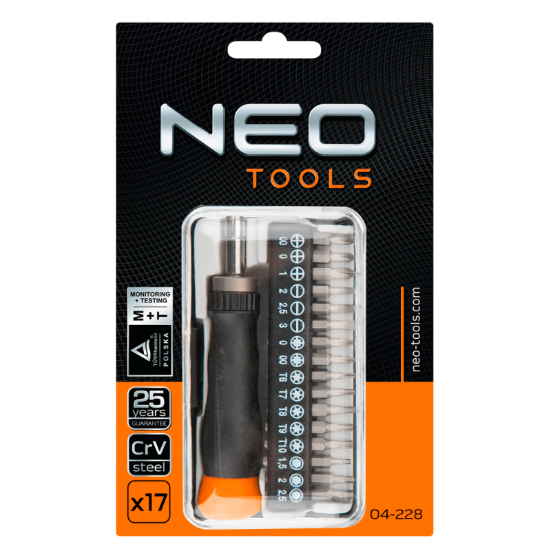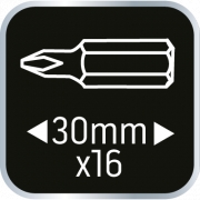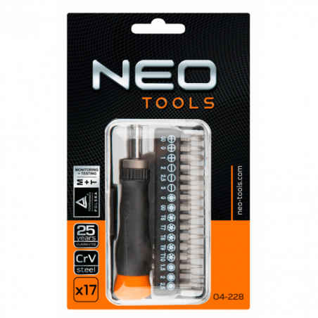 Końcówki wkrętakowe precyzyjne z uchwytem, zestaw 17 szt., uchwyt na końcówki wkrętakowe 5, 32", 16 szt. końcówek wkrętakowych 30 mm, rozmiary: płaskie 2.0, 2.5, 3.0 mm, krzyżowe PH00, PH0, PH1, PZ00, PZ0, Torx T6, T7, T8, T9, T10, sześciokątne H1.5, H2, H2.5 mm, stal CrV, etui z tworzywa, TÜV