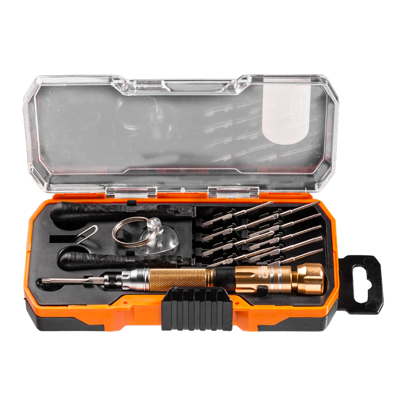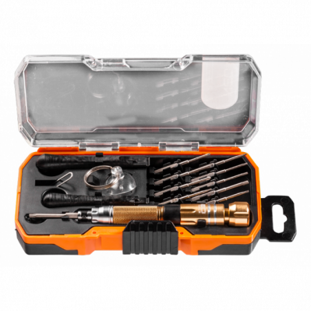 Zestaw do serwisowania smartfonów. Zestaw zawiera: 2 plastikowe podkładki do podważania obudów bez uszkodzeń, przyssawkę do pobezproblemowego zdejmowania szyb przy demontażu, uchwyt wkrętakowy z obrotową końcówką ułatwiającą pracę, końcówki PH000, PH00, płaską 1.2 mm, trójpiórkową, pięciokątną (pentagonal) 0.8 mm, T4, T5, T6, T8 z otworem, T10 z otworem, certyfikat TÜV M+T, 25 lat gwarancji