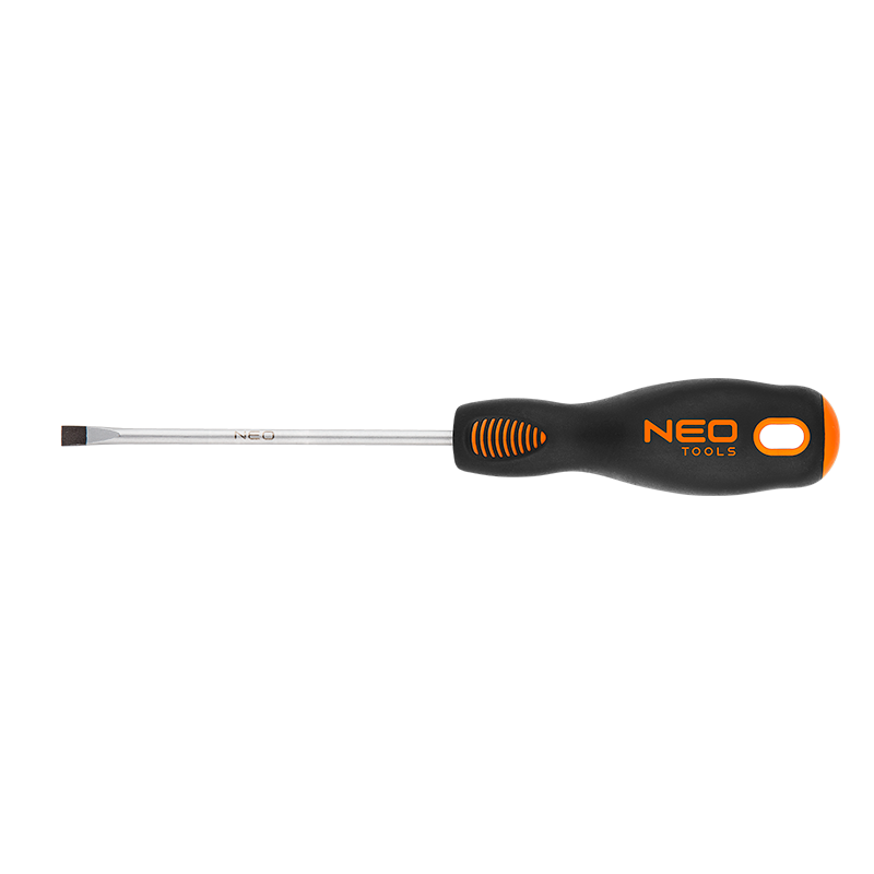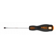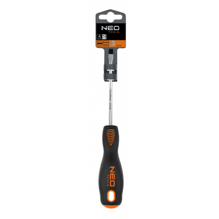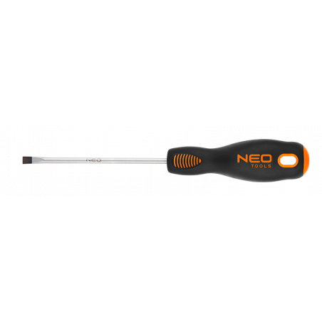 Wkrętak płaski 4.0 x 100 mm, S2, twardość końcówki roboczej 56 HRc, magnetyczna końcówka, trójgraniasty kształt uchwytu, wyprofilowane oparcie dla kciuka, uchwyt pokryty tworzywem TPR odpornym na działanie chemikaliów, olejów mineralnych, smarów, TÜV