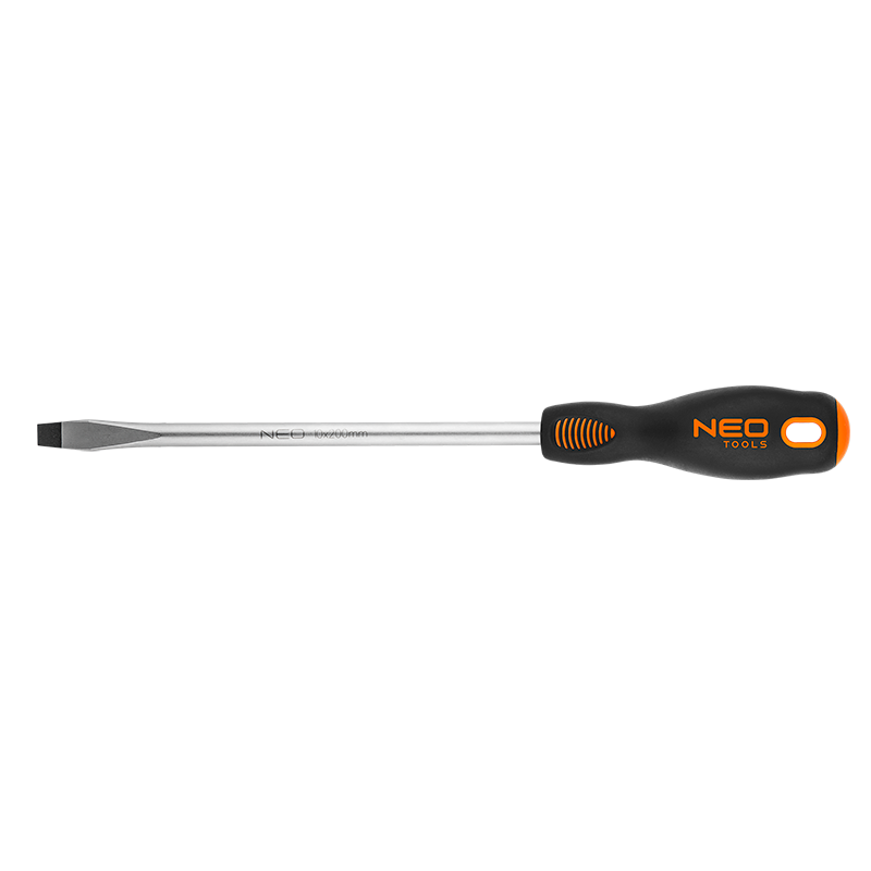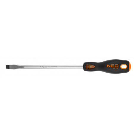 Wkrętak płaski 8.0 x 200 mm, S2, twardość końcówki roboczej 56 HRc, magnetyczna końcówka, trójgraniasty kształt uchwytu, wyprofilowane oparcie dla kciuka, uchwyt pokryty tworzywem TPR odpornym na działanie chemikaliów, olejów mineralnych, smarów, TÜV