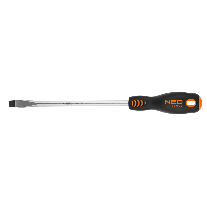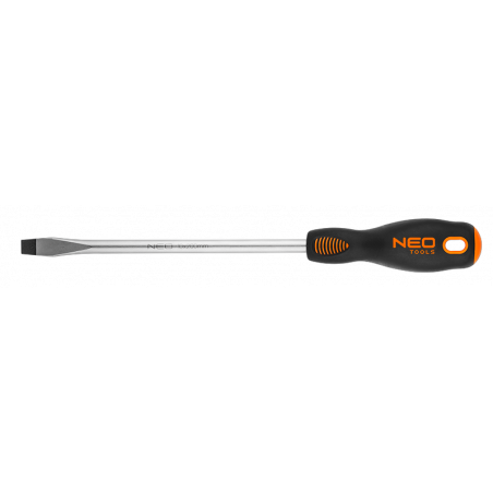 Wkrętak płaski 10.0 x 200 mm, S2, twardość końcówki roboczej 56 HRc, magnetyczna końcówka, trójgraniasty kształt uchwytu, wyprofilowane oparcie dla kciuka, uchwyt pokryty tworzywem TPR odpornym na działanie chemikaliów, olejów mineralnych, smarów, TÜV