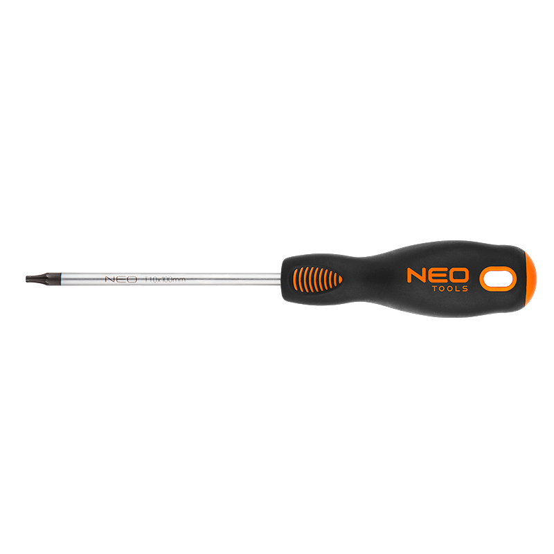 Wkrętak Torx T10 x 100 mm, S2, twardość końcówki roboczej 56 HRc, magnetyczna końcówka, trójgraniasty kształt uchwytu, wyprofilowane oparcie dla kciuka, uchwyt pokryty tworzywem TPR odpornym na działanie chemikaliów, olejów mineralnych, smarów, TÜV