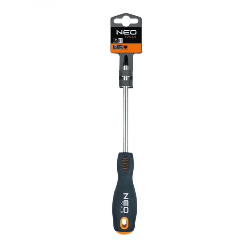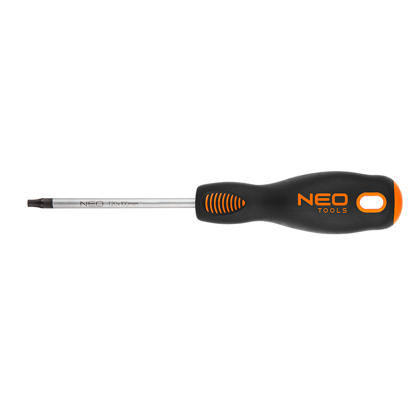 Wkrętak Torx T20 x 100 mm, S2, twardość końcówki roboczej 56 HRc, magnetyczna końcówka, trójgraniasty kształt uchwytu, wyprofilowane oparcie dla kciuka, uchwyt pokryty tworzywem TPR odpornym na działanie chemikaliów, olejów mineralnych, smarów, TÜV