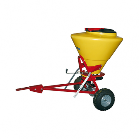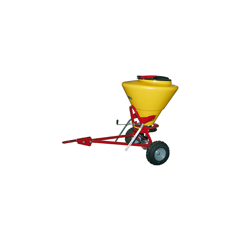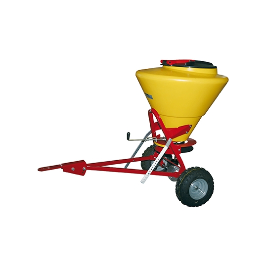 Wózek (przyczepa) do rozsypywanie materiałów sypkich z polietylenu, pozostałe części metalowe ze stali szlachetnej. Ogumienie pneumatyczne dostosowane do warunków zimowych. Rozsypywanie włącza się za pomocą zasuwy. Świetnie nadaje się do dużych powierzchni. Produkt posiada regulację przy uchwycie. Masywna przekładnia z aluminium i łożyska osiowe. Wózek sprzedawany wraz z pokrywą.