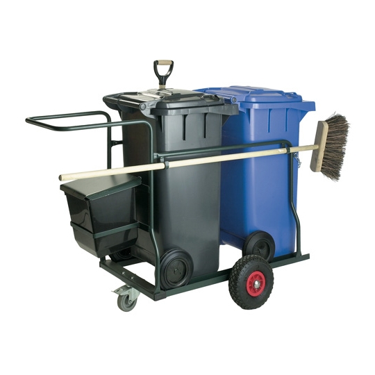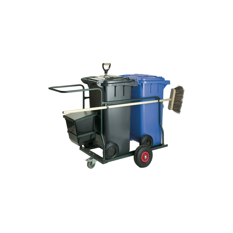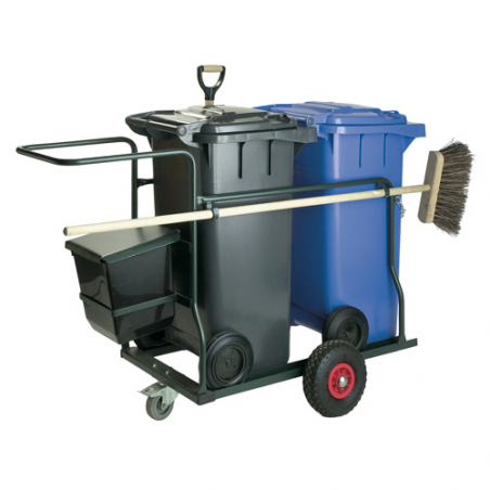 Wózek dostarczany z dwoma pojemnikami na odpady 120 litrów, szczotką, łopatą i małym pojemnikiem na śmieci 21 litrów.