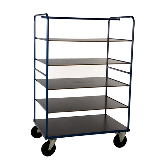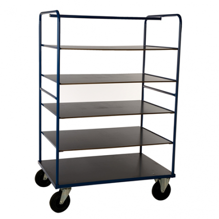 Prosty wózek transportowy wyposażony w dwa kółka stałe i dwa skręcone: 200 x 50 mm. Przestrzeń pomiędzy dwoma blatami: 580 mm. Odległość od płyty dolnej do pierwszej prowadnicy: 310 mm, a następne odległości pomiędzy prowadnicami 285 mm, rączka umieszczona na wysokości: 880 mm. W komplecie: 4 półki 16 mm MDF.