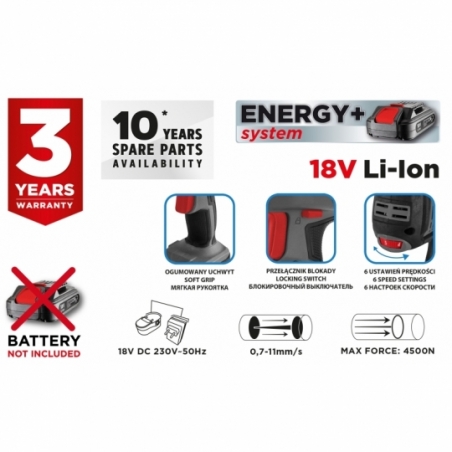 Wyciskacz do tub 310 ml 18 V bez akumulatora przeznaczone do prac wykończeniowych, budowlanych oraz uszczelniania rozmaitych powierzchni. Siła nacisku do 4500 N i prędkością wyciskania od 0.7 do 11 mm/s dostosowany do 310 ml tub. Wyciskacz wyposażony w 6 ustawień prędkości, antypoślizgowy uchwyt i blokada przed przypadkowym naciśnięciem. Waga 3,15 kg.