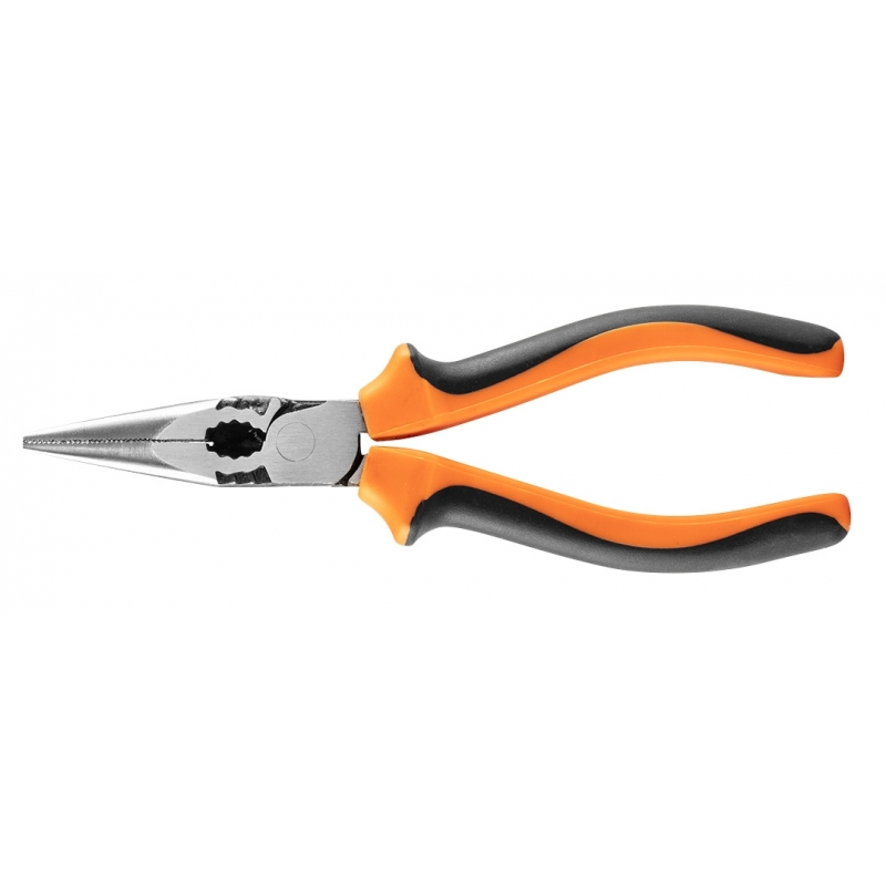 Szczypce wydłużone proste długość 160mm, 40% oszczędności siły dzięki przesunięciu trzpienia bliżej szczęk, stal chromowo niklowa antykorozyjna, uchwyt dwukomponentowy TPR+ABS, ząbkowana głowica.