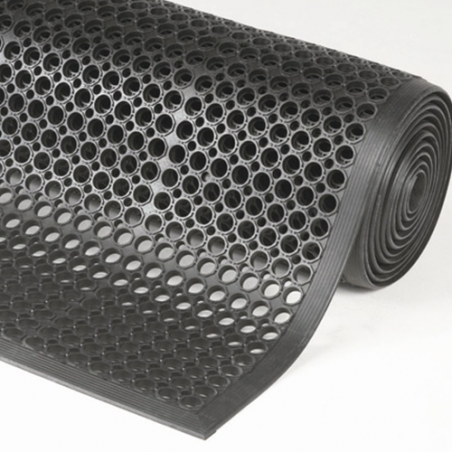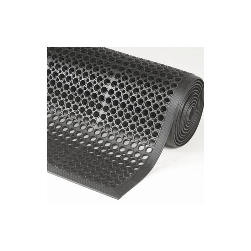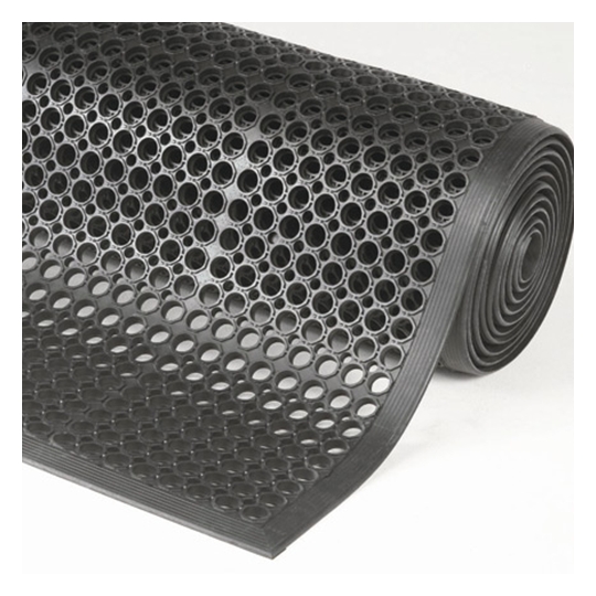 Wykładzina przemysłowa stosowana do obszarów suchych i mokrych. Otwory drenażowe i podwyższone kolce ułatwiają wentylację oraz powodują, że śmieci i ścieki mogą spłynąć, co pozostawia powierzchnię górna czystą i suchą. Mata odporna na silne chemikalia oraz niespodziewany poślizg. Materiał gumowy odciąża ciało od przemęczenia. Wygięte, umocowane kanty. Mała waga ułatwia szybkie i łatwe oczyszczanie.